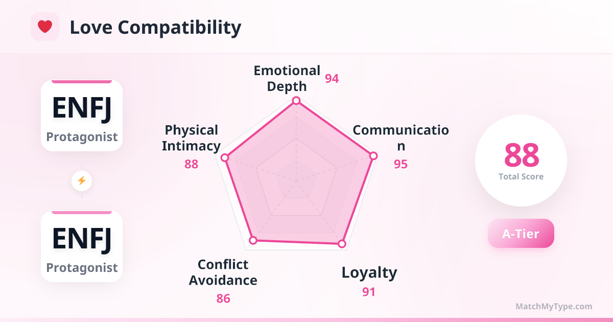 An ENFJ x ENFJ pairing is like looking in a mirror; you’ve finally met someone as eager to give, as detail-oriented, and as vocal about 'love' as you are. This relationship usually starts with a bang because both parties are masters of romance and emotional validation. However, when two 'Givers' unite, they can sometimes exhaust themselves competing to see who can sacrifice more, or bury real issues to maintain an artificial harmony.