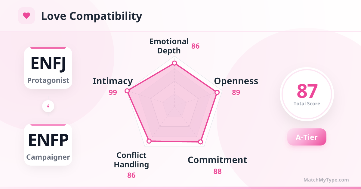 An ENFJ and ENFP pairing is like two fires meeting, instantly lighting up the room. This is a high-energy, high-interaction, and intensely romantic relationship. Neither of you is shy about expressing affection or showing vulnerability; every day feels like a romantic comedy filled with laughter and heartfelt tears.
