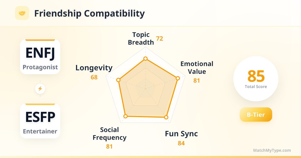 Full match. Both are high-energy extroverts (E) who fear silence and loneliness. ENFJ looks after everyone to ensure no one is left out; ESFP provides the laughs and the highlights. The difference: ENFJ socializes with purpose (networking), while ESFP socializes for fun. When ENFJ is drained (Fe exhausted), watching ESFP perform is healing.