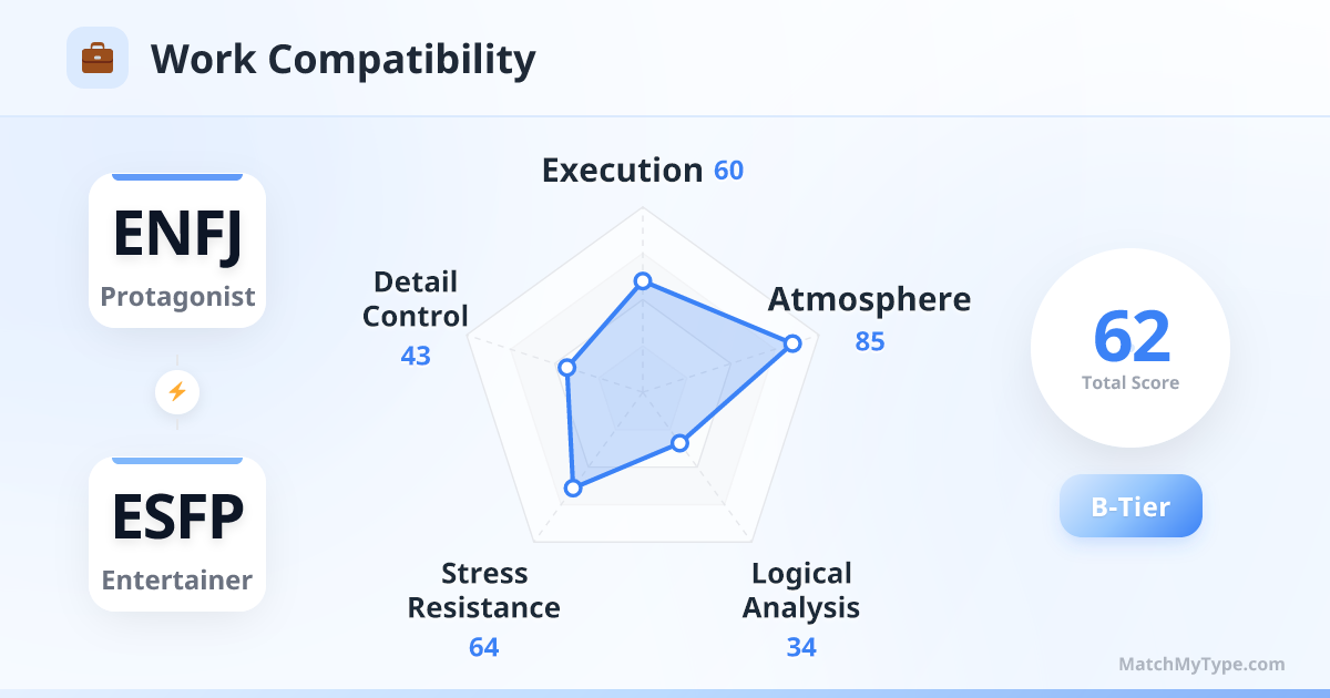 Ultimate Charisma. ENFJ excels at painting a vision and uniting people, while ESFP is great at working the room and handling interpersonal dynamics. In a roadshow or fundraiser, ENFJ handles the speech while ESFP handles the networking—an unbeatable combo.