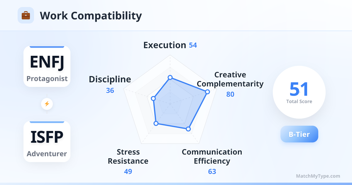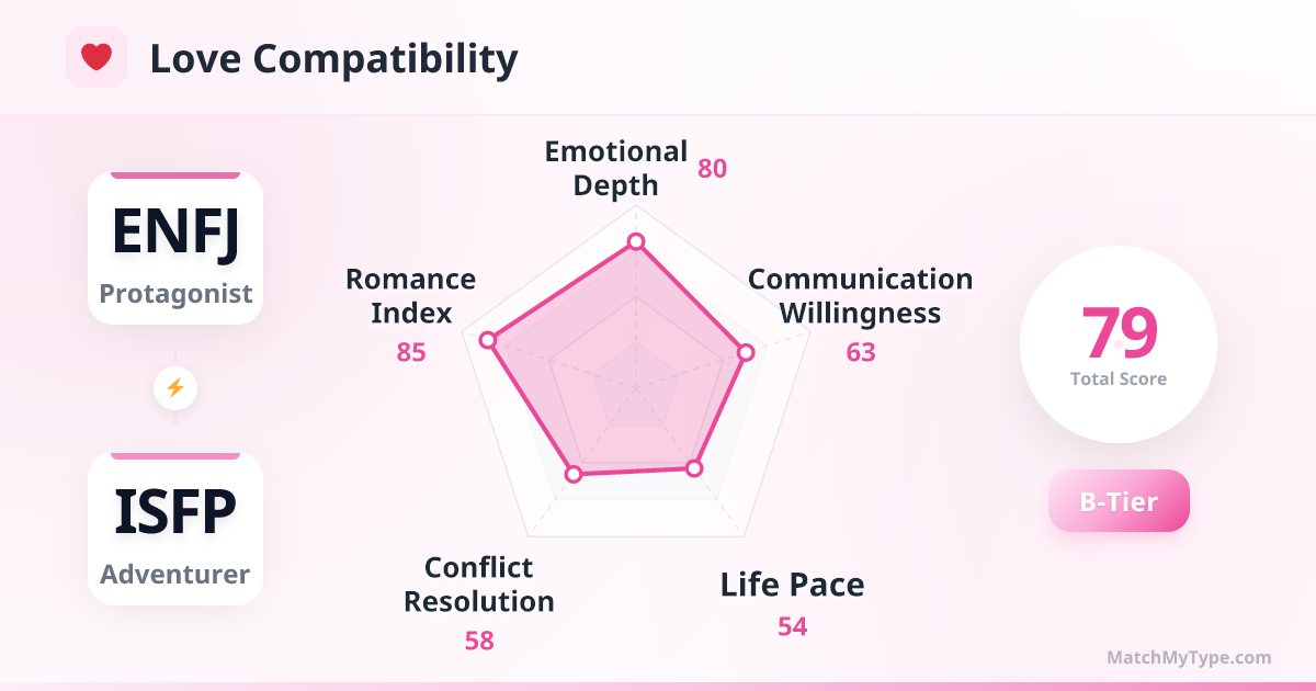 ENFJ is high energy; ISFP is low. At a party, ENFJ flies around while ISFP pets the cat in the corner. ENFJ's subtle care (bringing a drink) is heartwarming. Just don't push ISFP onto the stage; they'll die of embarrassment.