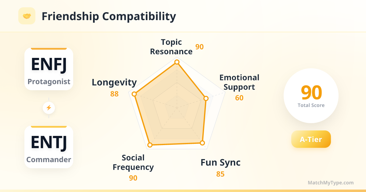 If you survive the friction, you form a perfect cabinet. The ENTJ handles external strategy and hard decisions; the ENFJ handles diplomacy and the home atmosphere. You become the 'power couple' everyone envies.