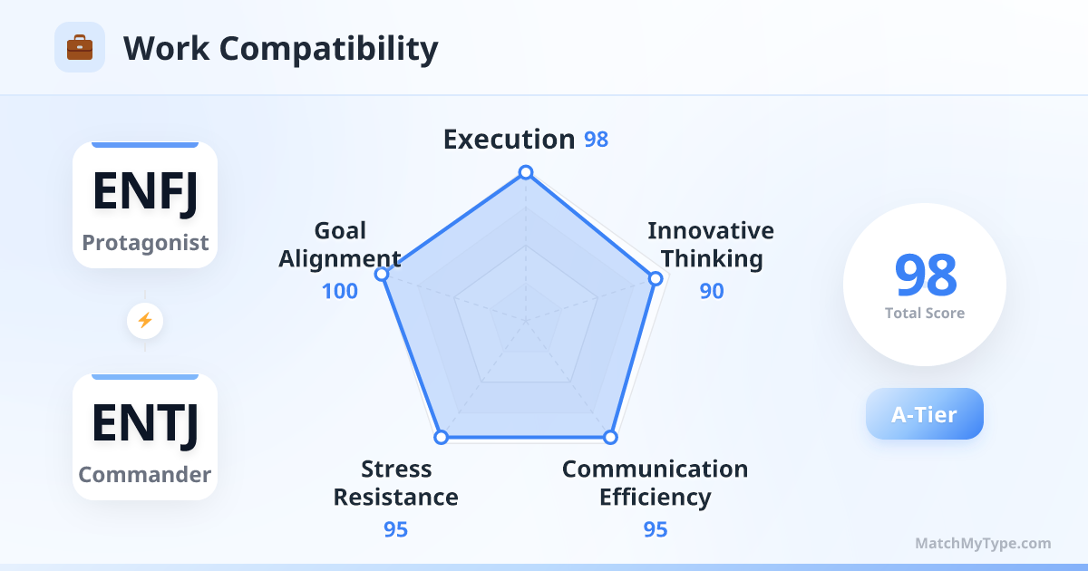 If ENFJ x INFP is the 'Dreamer Duo,' then ENFJ x ENTJ is the 'Dream Achiever Duo.' In a professional setting, this is a terrifyingly effective configuration. As long as you have a common goal, there is almost no project you can't conquer.
