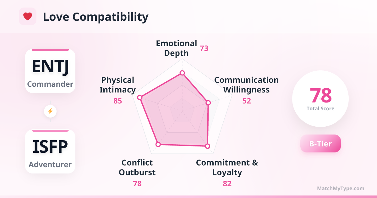In terms of sex, this is an S-Tier combination. Both have high-level Se (sensory functions), emphasizing physical touch, ambiance, and the pleasure of the moment. The ENTJ usually takes the lead, showing strong desire and technique, while the ISFP is full of sensuality and cooperation, often bringing unexpected artistic experiences to the ENTJ. 'Make-up sex' is common for this pair, as physical compatibility often mends the cracks in verbal communication.