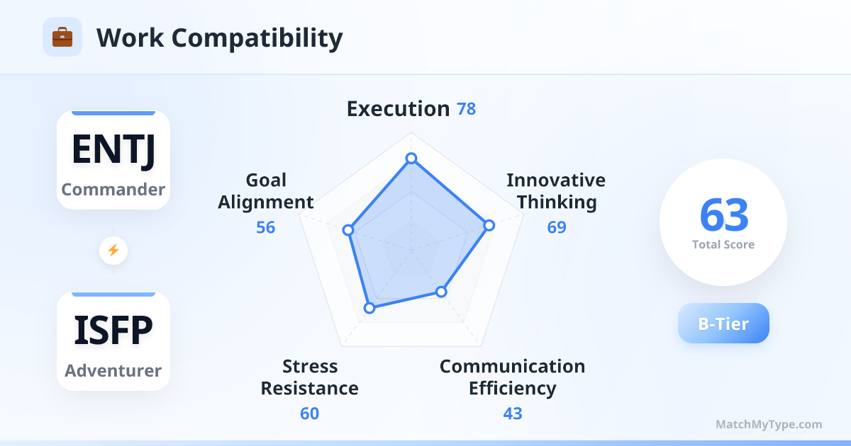 Pressure cooker mode. The ENTJ sets high KPIs and strict deadlines. When managing an ISFP, avoid micromanagement. Tell them the goal, then get out of the way. If the ENTJ hovers, the ISFP will simply quit.
