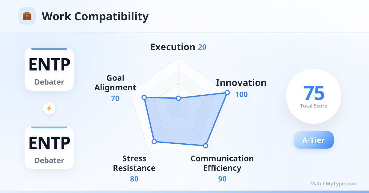 For two ENTPs, the brain is the sexiest organ. Foreplay is often a brilliant debate or relentless banter. In private, you are both explorers—happy to experiment with new ideas and taboos with zero shame. However, because you both lack the delicacy of Fi (Introverted Feeling), you might occasionally chase stimulation at the expense of genuine emotional connection. Remember to slow down for some 'boring' soul-to-soul talk.