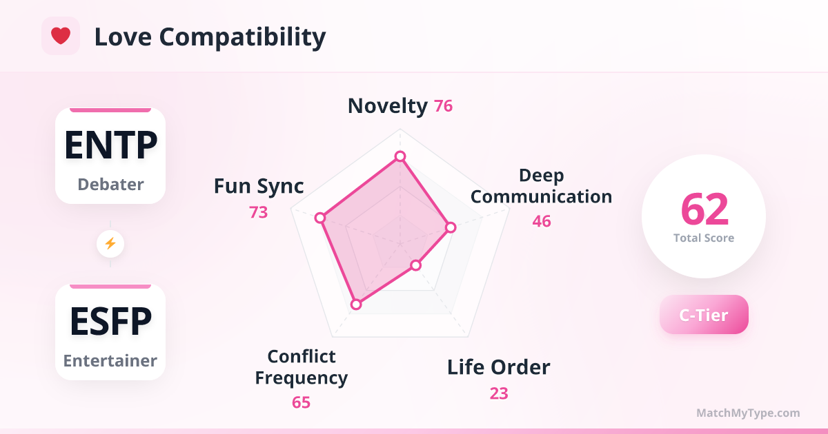 This is a dopamine-fueled combination. Both ENTP and ESFP are Extraverted Perceivers (ExxP), meaning your life together will never be dull. The ENTP provides a constant stream of wild ideas and wit, while the ESFP brings immediate sensory pleasure and warm responsiveness. However, once the initial high fades, the collision between abstract logic and personal values becomes a hurdle you must clear.