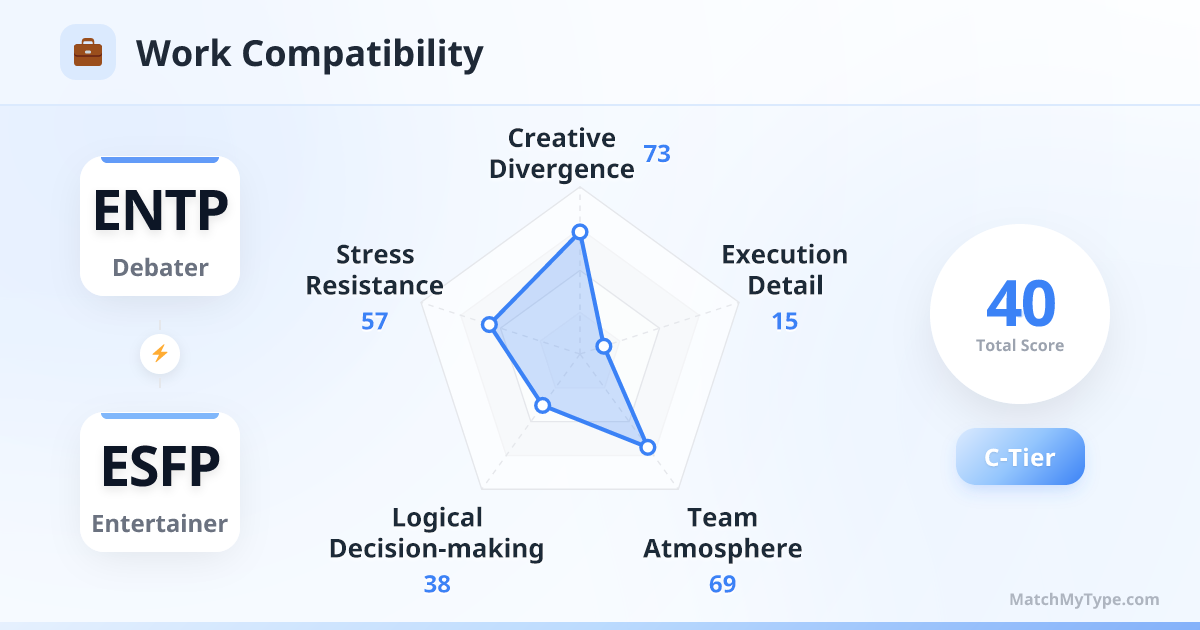A total disaster for details. ENTPs hate repetitive tasks, and ESFPs hate boring paperwork. Once a project enters the execution phase—requiring fine-tuning, spreadsheets, and follow-ups—both will try to pass the buck or procrastinate together until the final second.