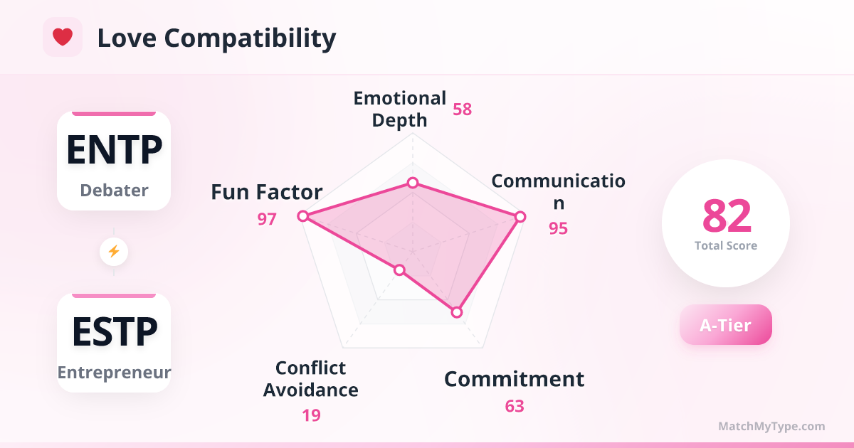 This relationship is like two cheetahs racing across the savannah—full of speed, passion, and intellectual sparring. As ENTP and ESTP, you are both extroverted, rational, and have a shared allergy to boredom (ExTP). You don't need mushy emotional validation; a knowing look, a sharp joke, or an impromptu adventure is your way of saying 'I love you.'