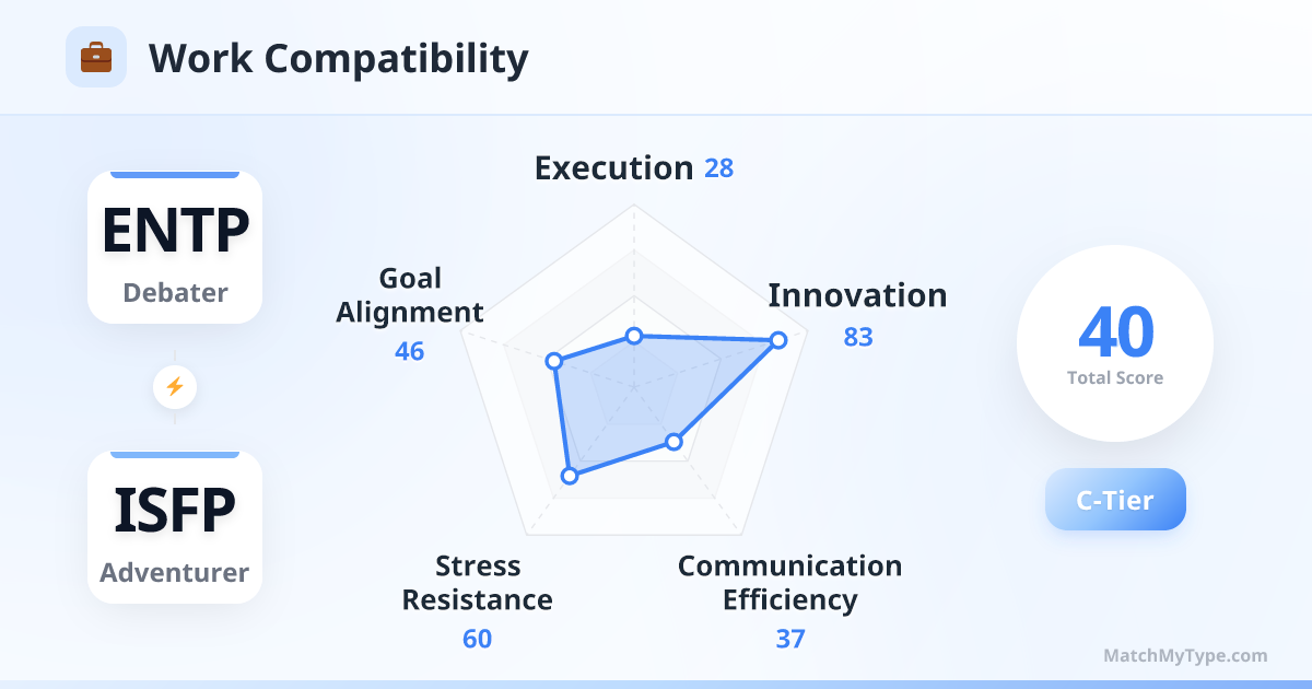 A 'Dual P' disaster. Both hate rigid rules, administrative processes, and deadlines. ENTP tends to start strong but lose interest; ISFP suffers from 'late-stage procrastination' in the pursuit of perfection. Without a third-party supervisor, projects often go unfinished.