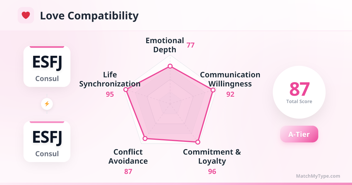 An ESFJ and ESFJ union is one of the most 'down-to-earth' and heartwarming combinations in MBTI. You don't need many verbal probes because you share the same social script and values. This is a deep connection based on 'security' and 'belonging,' where you will build an indestructible family fortress together.