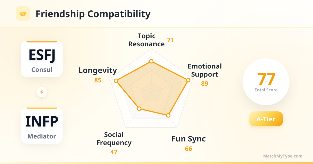 Total opposites. ESFJ recharges in crowds; INFP recharges alone. In friendship, ESFJ often plays the 'protector' role, shielding the socially anxious INFP at parties. INFP serves as the ESFJ's 'confessional,' where ESFJ can drop the social mask and speak their true heart.