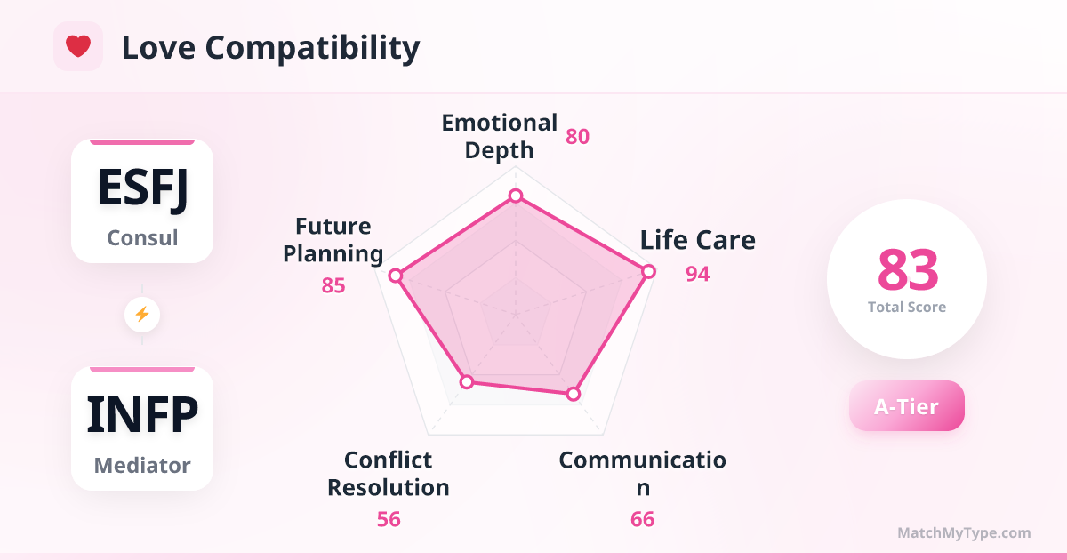 The most grounded protection meets the most romantic soul. ESFJ keeps the INFP fed and warm, while INFP shows ESFJ the stars beyond the daily grind