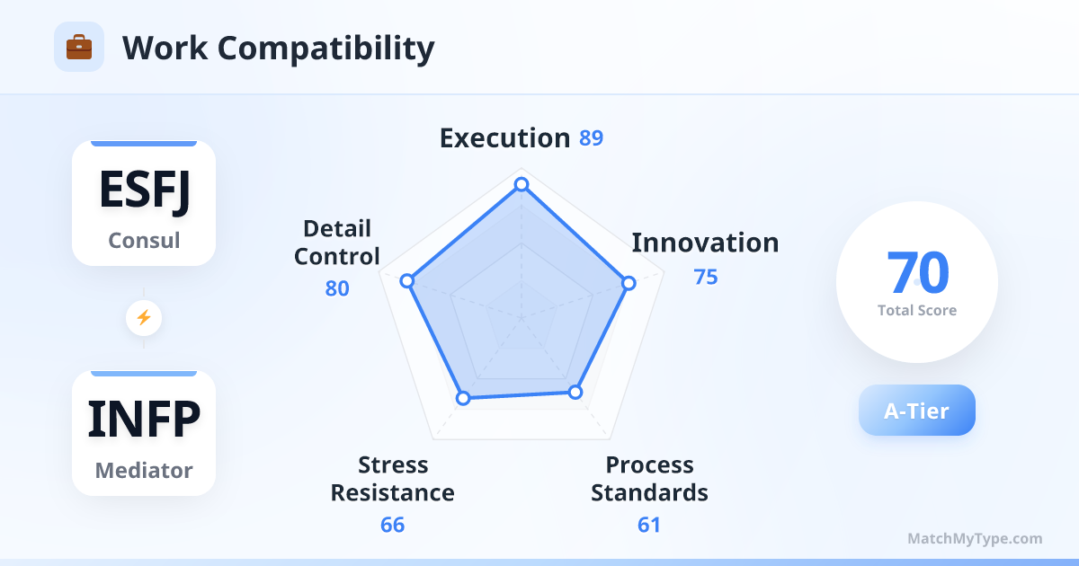 Rhythm desync. ESFJ wants things done today; INFP waits for the last-minute spark. ESFJ's anxiety over INFP's procrastination turns them into a micromanager, which triggers INFP's rebellion and lowers efficiency further.