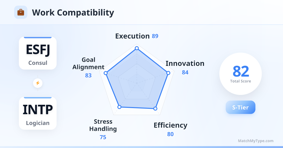 The 'Dream Team.' ESFJ excels at coordination and management; INTP excels at strategy and troubleshooting. Together, they are unstoppable.