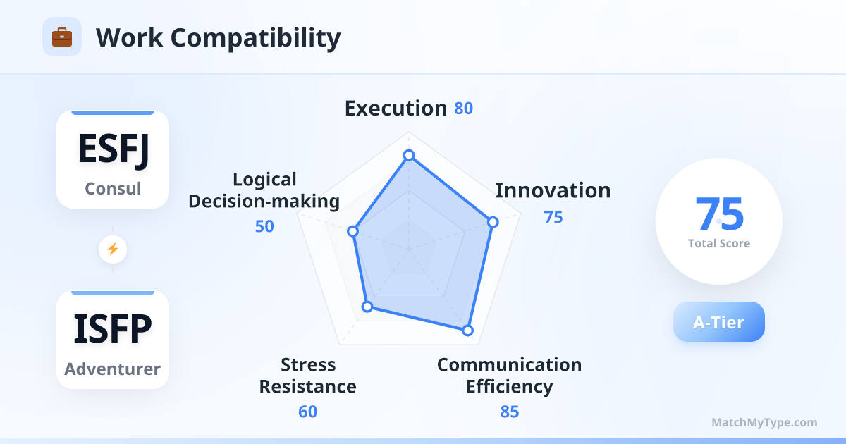 The office 'happy hour' duo. You’ll order milk tea together, gossip, and decorate your desks. But when collaborating on projects, duties must be clear: ESFJ handles the flow and deadlines, while ISFP handles content and quality. Otherwise, you'll both procrastinate until the last minute.