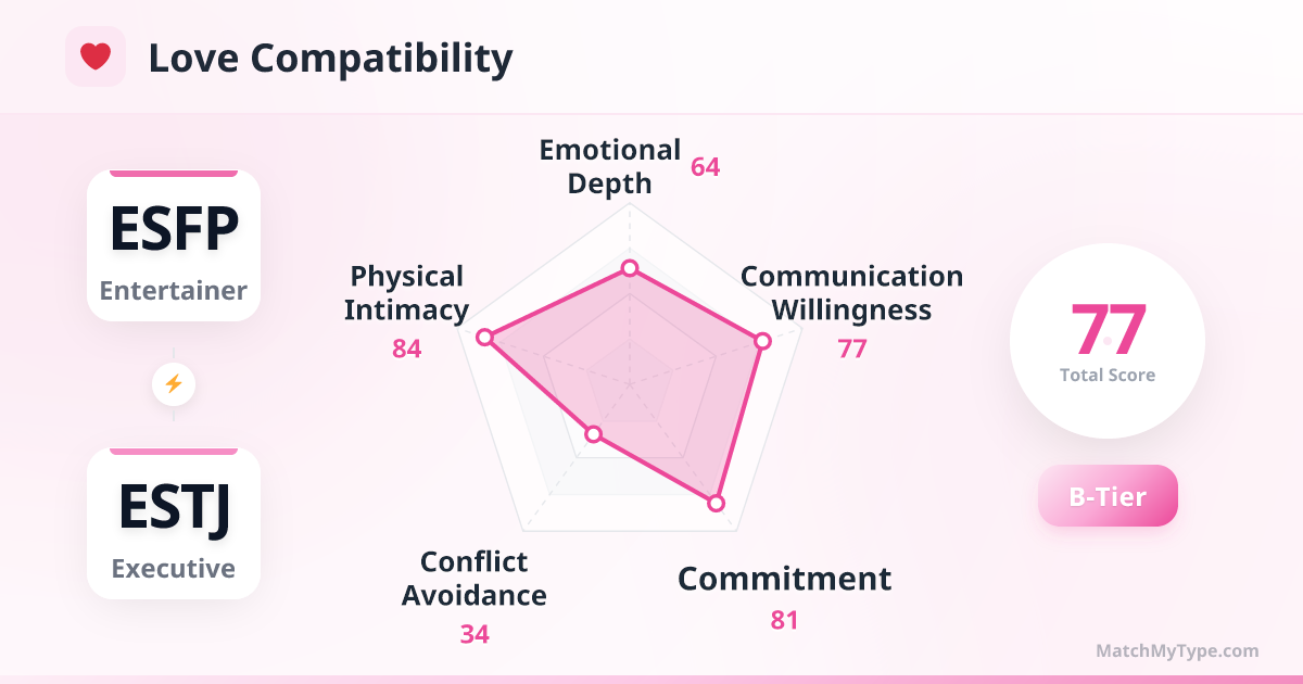 This is a high-octane relationship. ESTJ provides the stability and security ESFP lacks, while ESFP injects color and surprises into ESTJ's routine life. Though one is a 'control freak' and the other a 'free soul,' both live in the moment and value sensory experiences, making it easy to build a grounded yet passionate happiness.