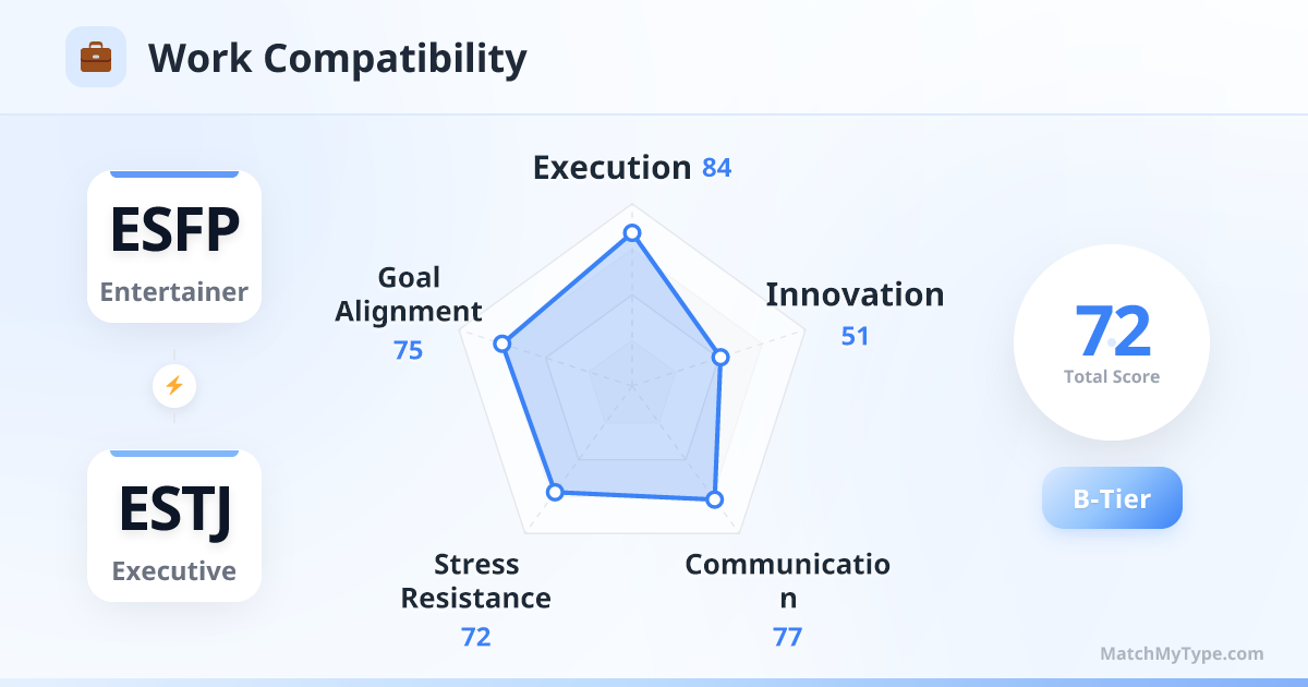 Incredible execution. Both are doers who hate empty talk. ESTJ sets the KPIs; ESFP hits the pavement to close deals. This duo is unbeatable in sales, PR, and event execution.