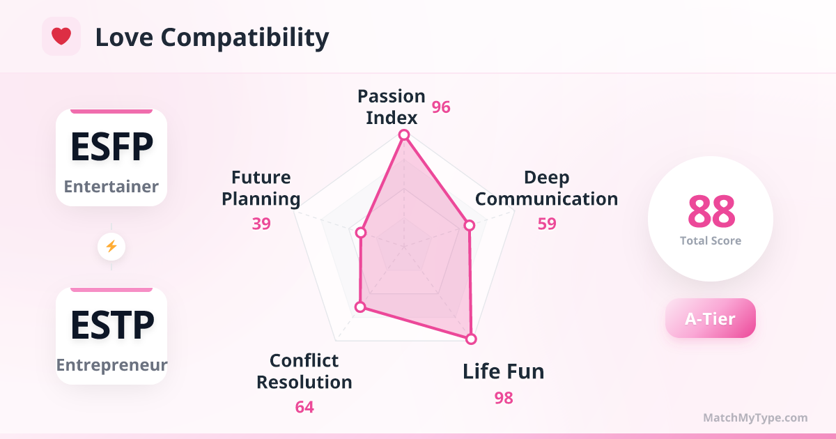 If you survive the friction, the ESTP learns to listen to the ESFP's feelings without fixing them, and the ESFP learns to appreciate the ESTP's practical support. You become a 'Comrade + Playmate' duo against the world's boredom.