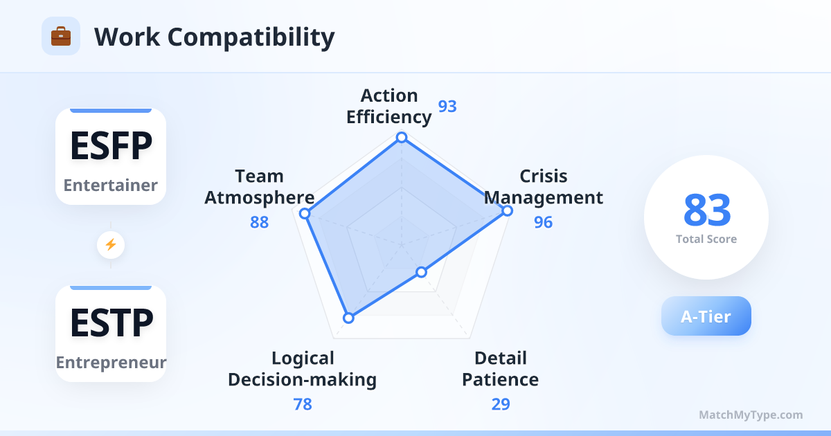 The office 'fun duo.' You'll bond over mocking stupid rules and ordering boba together. For projects, split the work: ESFP handles the 'soft' side (copywriting, client relations), while ESTP handles the 'hard' side (pricing, logistics, deadlines).