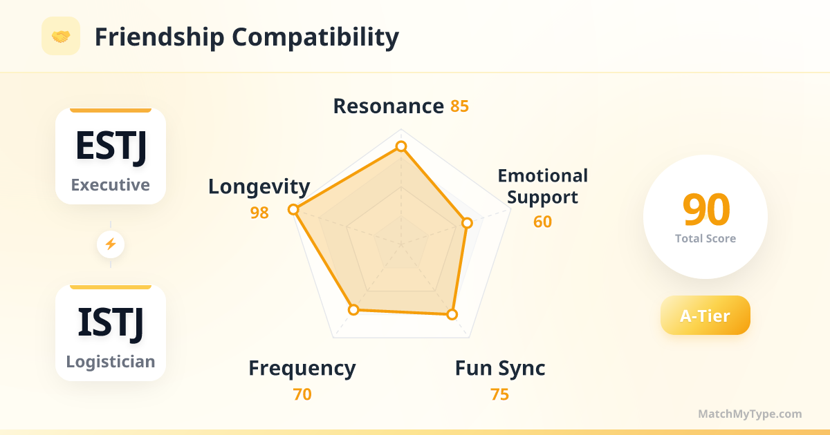 Natural fit. ESTJ loves giving orders; ISTJ loves receiving clear ones. As long as ESTJ's logic is sound and they don't change their mind constantly, ISTJ is the perfect executor. ESTJ will value ISTJ's reliability but must remember to credit them even if they don't self-promote.