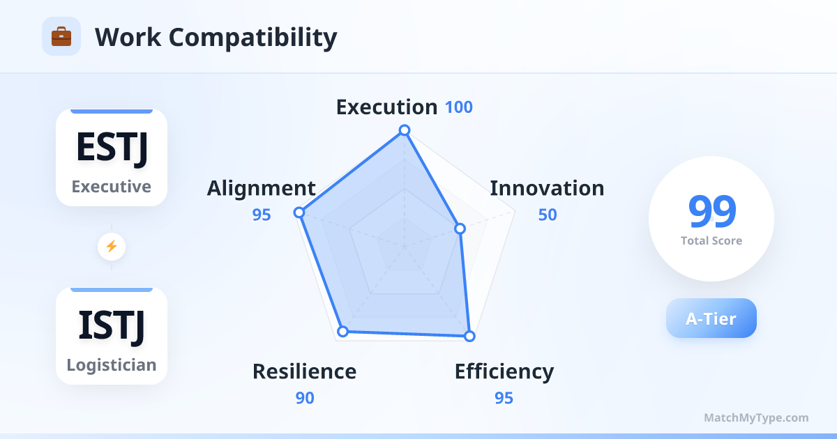 Efficient and pragmatic. You both hate useless meetings. ESTJ moderates to keep things on track; ISTJ records and corrects detail errors. Every meeting must end with clear Action Items.