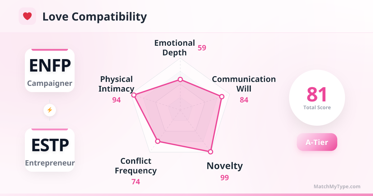 This is a pair that will never be bored. ENFP provides the script, and ESTP handles the performance. Your relationship is like a fast-paced action-comedy—full of laughter, adventure, and unpredictable twists. But when the lights go down, bridging the gap between 'emotion' and 'logic' is the key to going the distance.