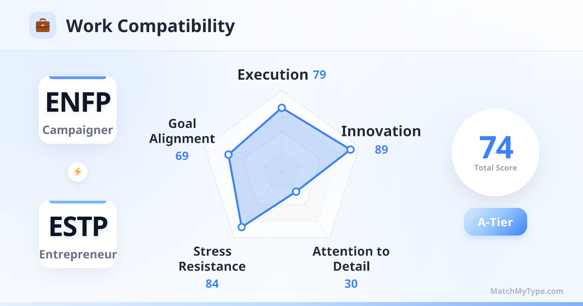 Brainstorming and fast monetization. ENFP uses Ne to dream up creative marketing or product concepts; ESTP uses Se and Ti to quickly assess feasibility and use their network to make it happen. In pitches, roadshows, or winning over big clients, you're unbeatable.