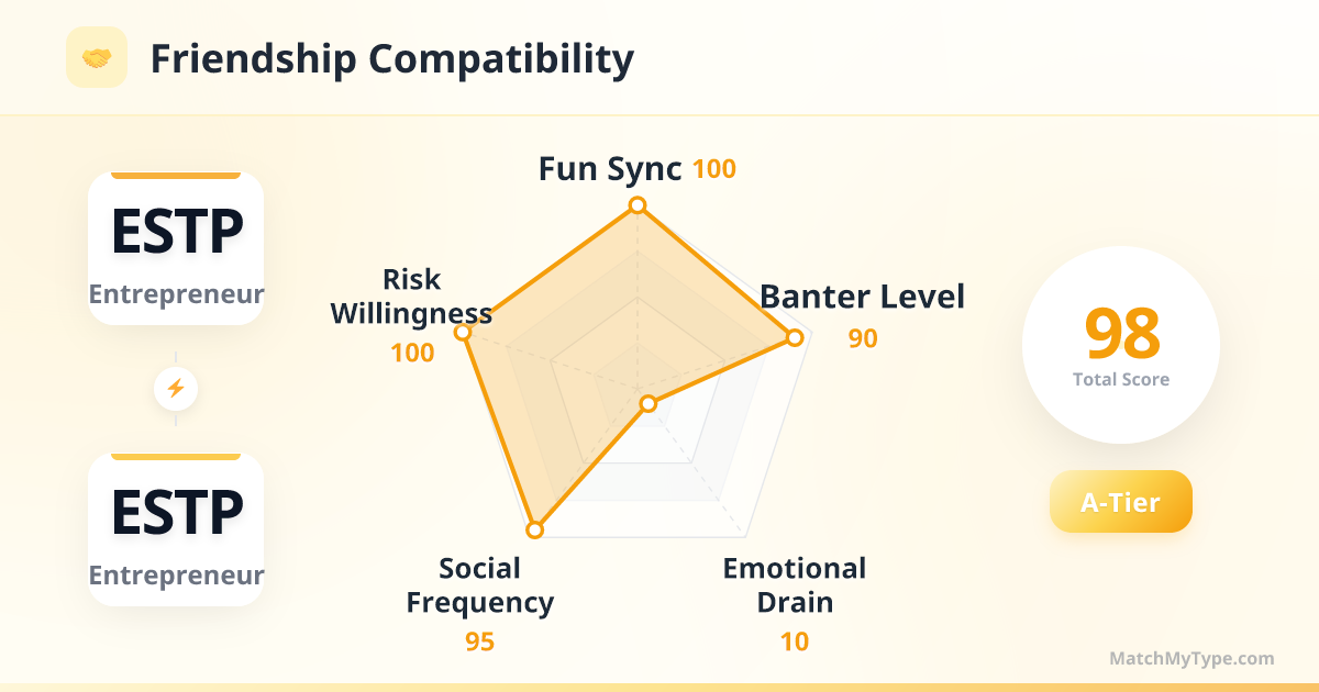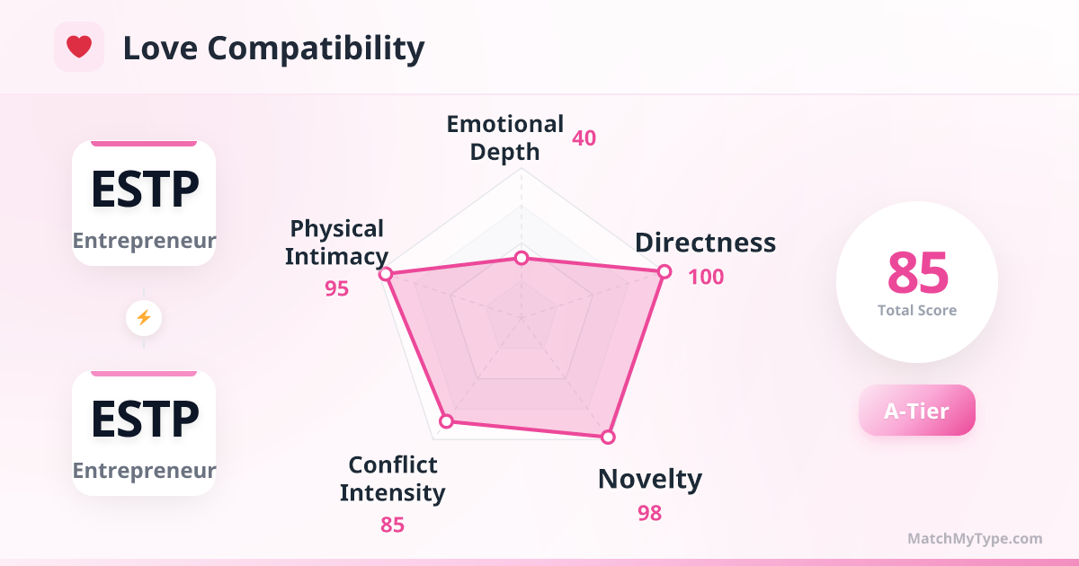 An ESTP-ESTP pairing is a carnival that rejects all 'drama' and 'mind games.' You are each other's best playmates, comrades, and rivals. This relationship is fueled by dopamine and adrenaline, but without deep connection, it can easily turn into 'strangers with memories' once the thrill fades.