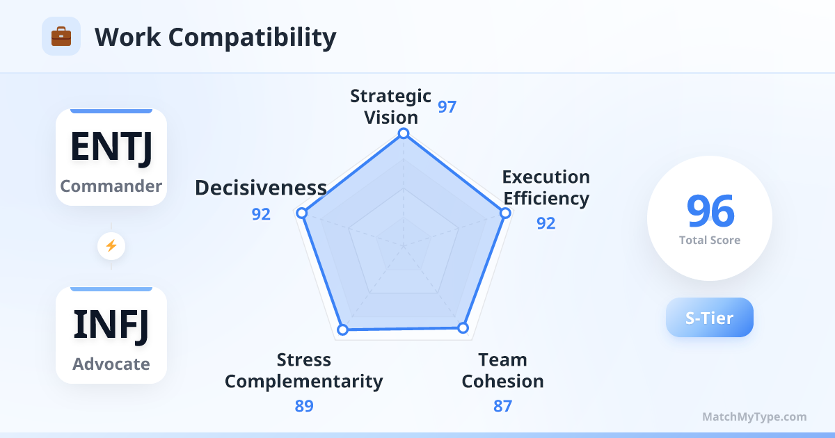 Strategic Loop. ENTJ excels at strategy, resource allocation, and progress; INFJ excels at human insight, risk prediction, and culture building. ENTJ handles 'hard power,' while INFJ handles 'soft power.'