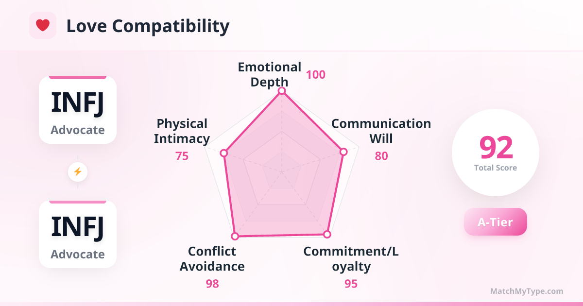 The meeting of two INFJs is often described as 'finally finding that long-lost twin.' In a world full of misunderstandings, you are each other's only safe harbor. This relationship needs few words; a single look can convey a thousand. However, two deep whirlpools spinning too close can trigger a massive emotional tsunami.