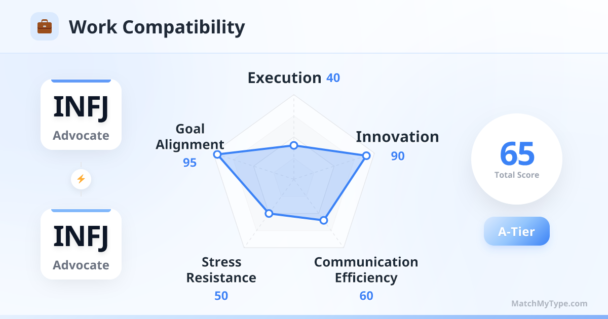 In the workplace, the INFJ-INFJ duo is the classic 'Dream Factory.' You have the perfect vision, high values, and deep insights, but you often lack the 'bricklayer' spirit to make it real. Without someone tracking the progress bar, projects may stay in the 'perfect concept' phase forever.