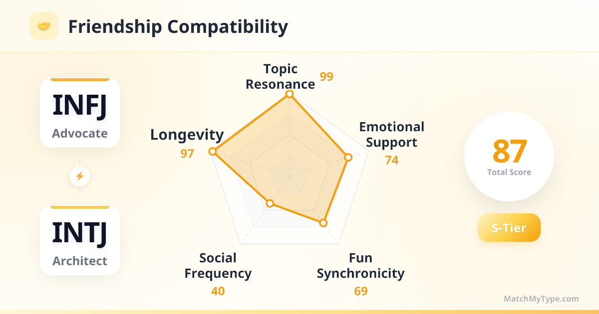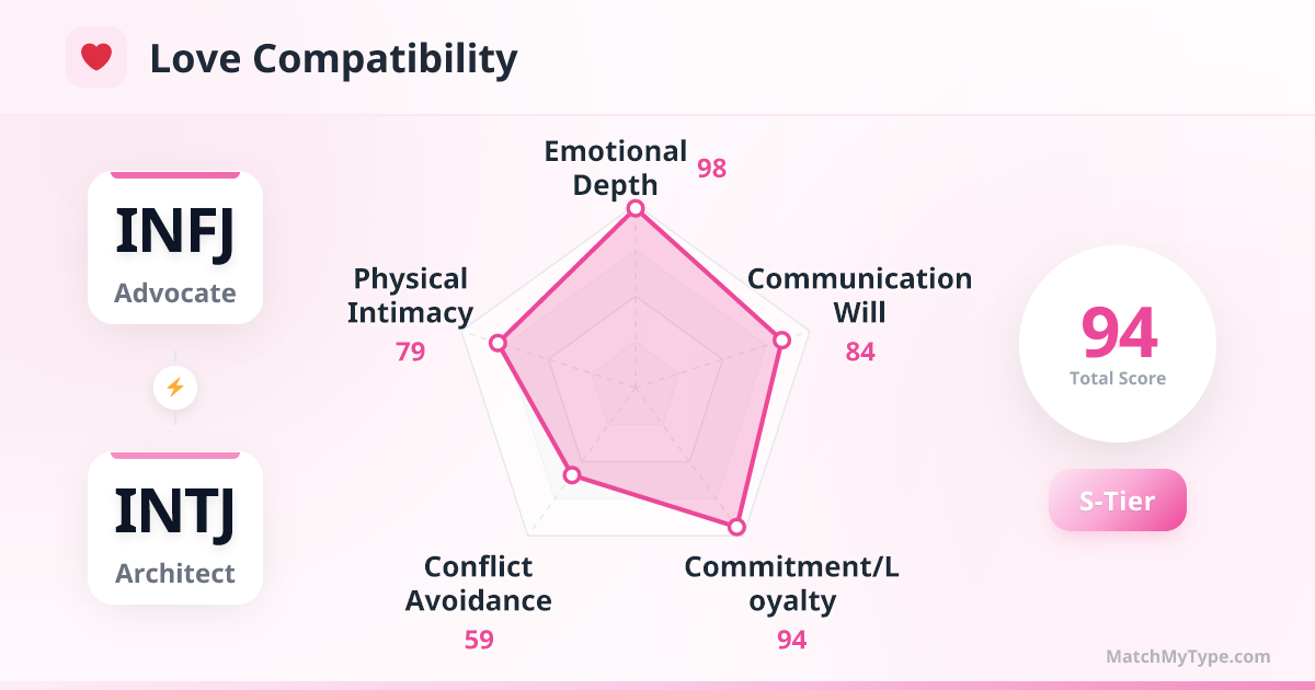 One of MBTI's strongest 'Vision + Execution' pairings. INFJ paints the grand blueprint; INTJ builds the system and executes. As long as goals align, you can destroy any obstacle.