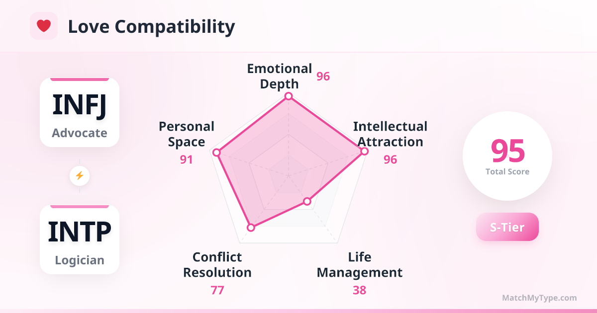INTP learns to hug before analyzing; INFJ learns to state needs directly rather than making the partner guess. INFJ becomes INTP's bridge to the world, and INTP becomes INFJ's inner anchor. It's a stable, exclusive spiritual contract.