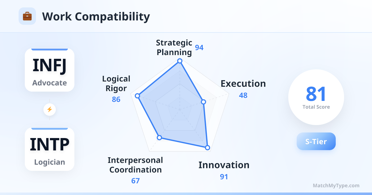 Perfect macro-alignment. INFJ excels at the 'human factor' and market trends (Ni+Fe), while INTP solves complex technical problems and system architecture (Ti+Ne). In a tech company, INTP is the CTO and INFJ is the CPO or CHO; together, they create products with both technical depth and human soul.