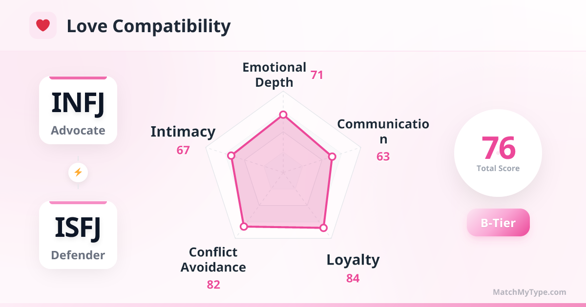 The union of an INFJ and an ISFJ isn't usually a 'lightning strike' of passion, but rather a gentle rain that nourishes the soul over time. Sharing the Fe (Extraverted Feeling) auxiliary function, you are perhaps the two people most capable of nurturing each other's emotions. In a harsh world, you build a soft bunker for two.