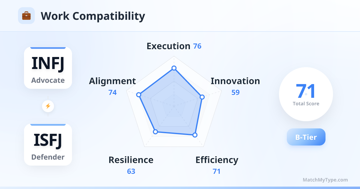In a professional setting, this is a highly constructive duo. The INFJ is the architect drawing the blueprints; the ISFJ is the engineer laying the bricks. With clear roles, you can turn 'airy ideas' into 'solid results.'