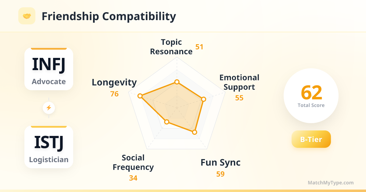 This isn't the kind of whirlwind romance you see in Hollywood; it's a century-long alliance. Both INFJ and ISTJ are Introverted Judging types (IxxJ), meaning you both crave order, certainty, and loyalty. INFJ brings the warmth and vision the ISTJ lacks, while ISTJ provides the grounding and stability INFJ dreams of.