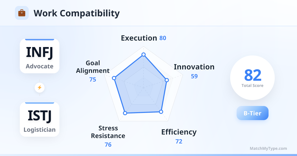 This is a workplace 'Dream Team.' INFJ points the way, and ISTJ ensures you get there. One is responsible for 'doing the right things' (strategy), and the other for 'doing things right' (execution).
