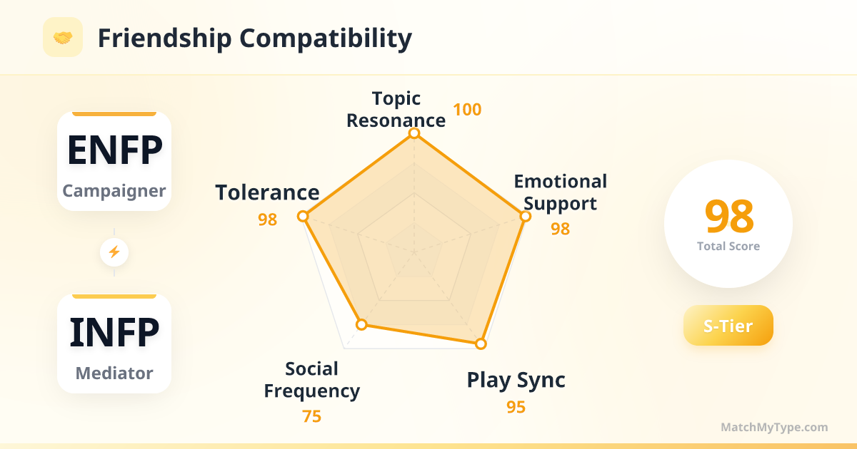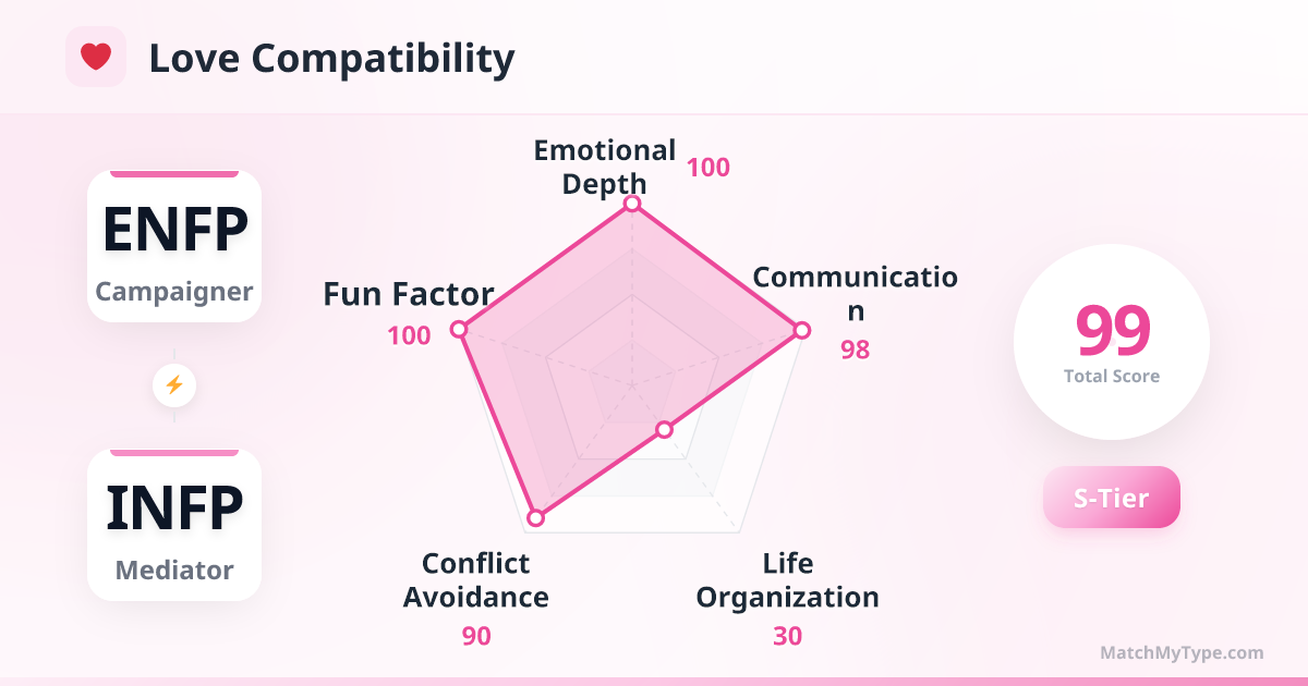 It’s the ecstasy of 'finding your own kind.' ENFPs are often misunderstood as just 'happy puppies,' but INFPs can see right through the depth and vulnerability behind the smile. INFPs are often seen as aloof loners, but ENFPs find their inner world to be an inexhaustible treasure trove. ENFP’s passion (Ne) ignites INFP’s imagination, while INFP’s depth (Fi) provides a safe harbor for the floating ENFP. You are each other's safe house in this utilitarian world.
