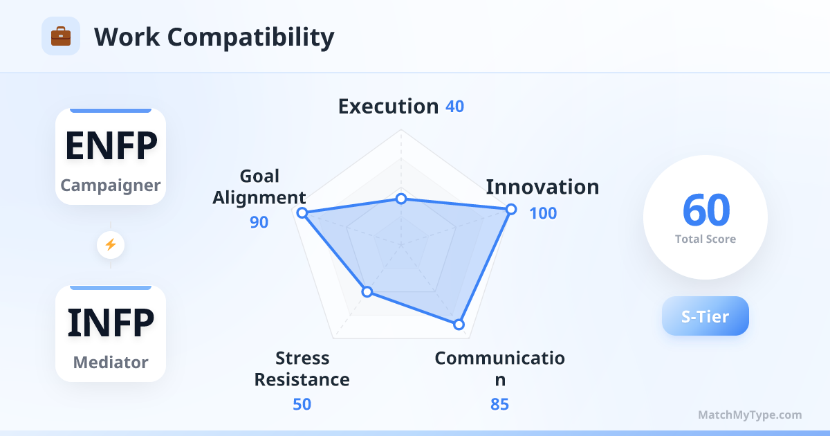 The ultimate 'slacking off' duo. If you sit together, productivity will plummet because the temptation to chat is too great. Best approach: ENFP handles external relations and presentations; INFP handles content creation and aesthetics. Find a third party to manage the timeline.