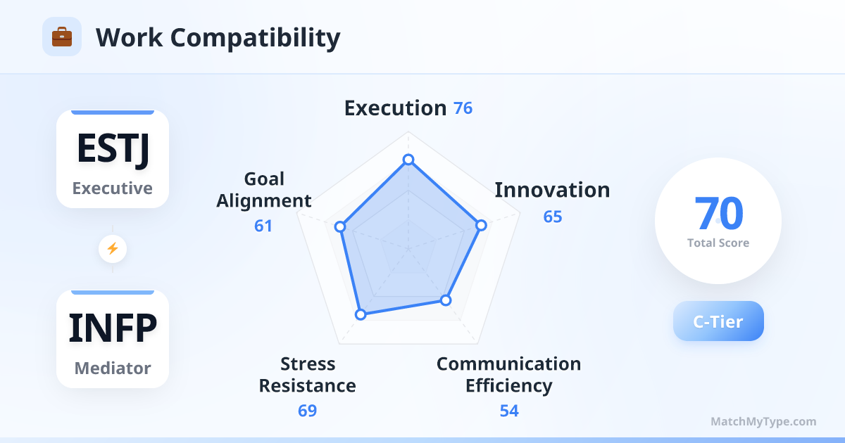 A high-pressure combo. The ESTJ boss watches the clock and KPIs. The INFP subordinate will feel stifled. INFP should focus on results and keep the 'process' private. ESTJ should give INFP creative autonomy and avoid micromanagement.