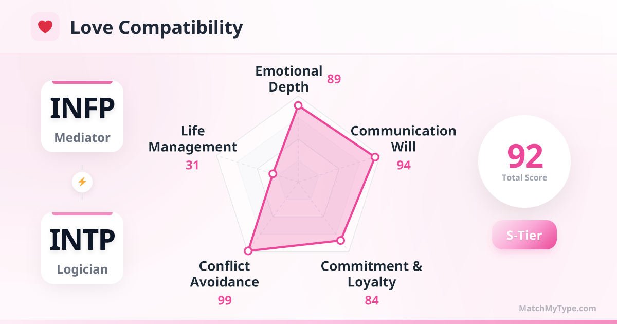 This is a story of 'The Warmest Robot' meeting 'The Most Rational Elf.' INFP is drawn to INTP's pure, unvarnished authenticity and high IQ, seeing them as the only non-fake person in the world. INTP is captivated by INFP's rich emotional landscape and unique aesthetic—INFP is one of the few who can keep up with INTP's jumping thoughts without calling them 'weird.' Together, you can talk from quantum mechanics to what's for dinner; that intellectual seamlessness is incredibly sexy.