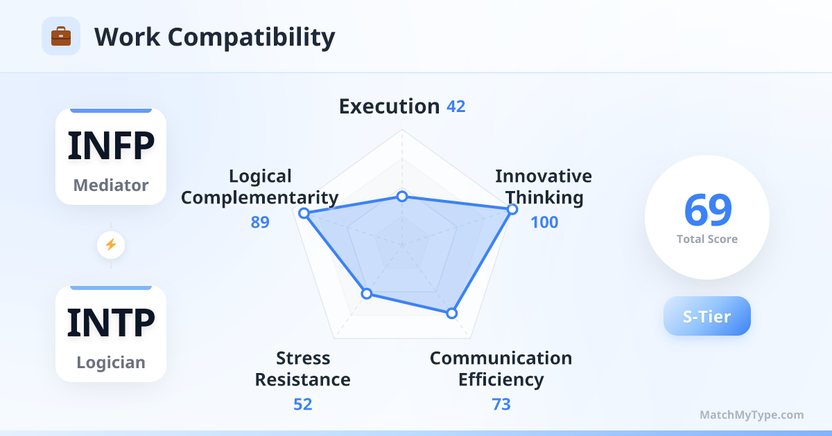 Mental nuclear fusion. INFP provides human-centric values and aesthetic intuition; INTP provides rigorous logical architecture and technical implementation. In product design, writing, art, or academia, you can produce top-tier work that has both depth and soul.