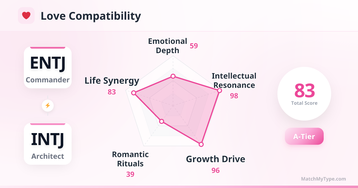 This relationship usually lacks pink bubbles, replaced instead by reinforced-concrete trust and a shared vision. For ENTJ and INTJ, love isn't about staring at each other; it's about looking toward the same ambitious future. This is the classic 'Power Couple' configuration.