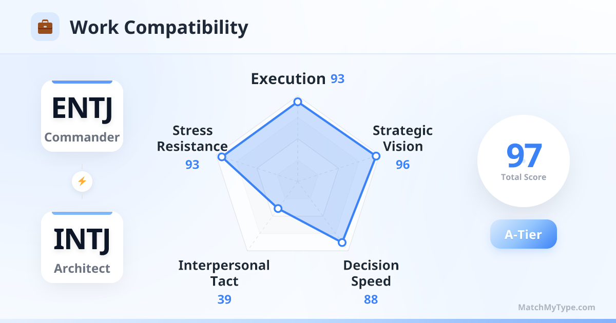 The golden combo. ENTJ gives INTJ autonomy and a clear goal; INTJ delivers perfection. ENTJ shields INTJ from office politics and useless meetings, letting them focus on strategy.