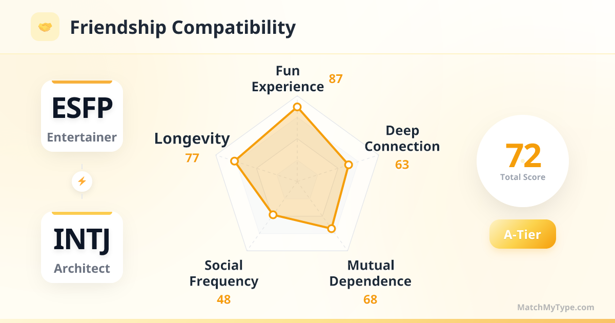 This pair is a classic 'Functional Mirror' combo, sharing the same middle functions (Fi-Te) but having completely opposite perceiving functions (Se-Ni): **Se (Extraverted Sensing) vs. Ni (Introverted Intuition)**: This is the core of both conflict and attraction. ESFPs see things as they are, seeking sensory stimulation; INTJs see the hidden meanings and future trends. The INTJ envies the ESFP's ability to be happy anywhere, while the ESFP admires the INTJ's 'superpower' of foresight. **Fi (Introverted Feeling) Resonance**: Despite the massive outward differences, both use Fi as their emotional compass. This means that deep down, you both hold highly personal, non-conformist moral codes and values. Once you confirm the other is 'one of us,' this hidden value-based connection becomes incredibly solid and far more profound than outsiders realize.