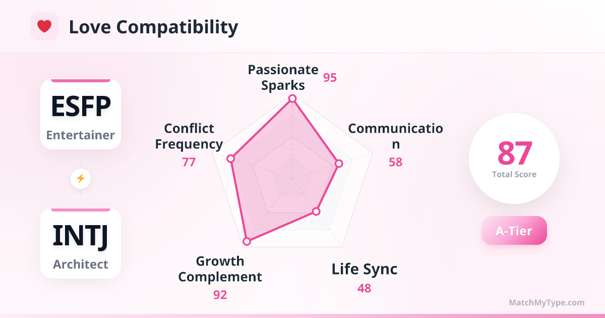 This is arguably the most dramatically charged pair in the MBTI universe. One is a sensory master living for the moment (ESFP), and the other is a cold-faced tactician living for the future (INTJ). This extreme polarity often triggers a primal spark—because each possesses the parts of the self that the other subconsciously craves yet suppresses.