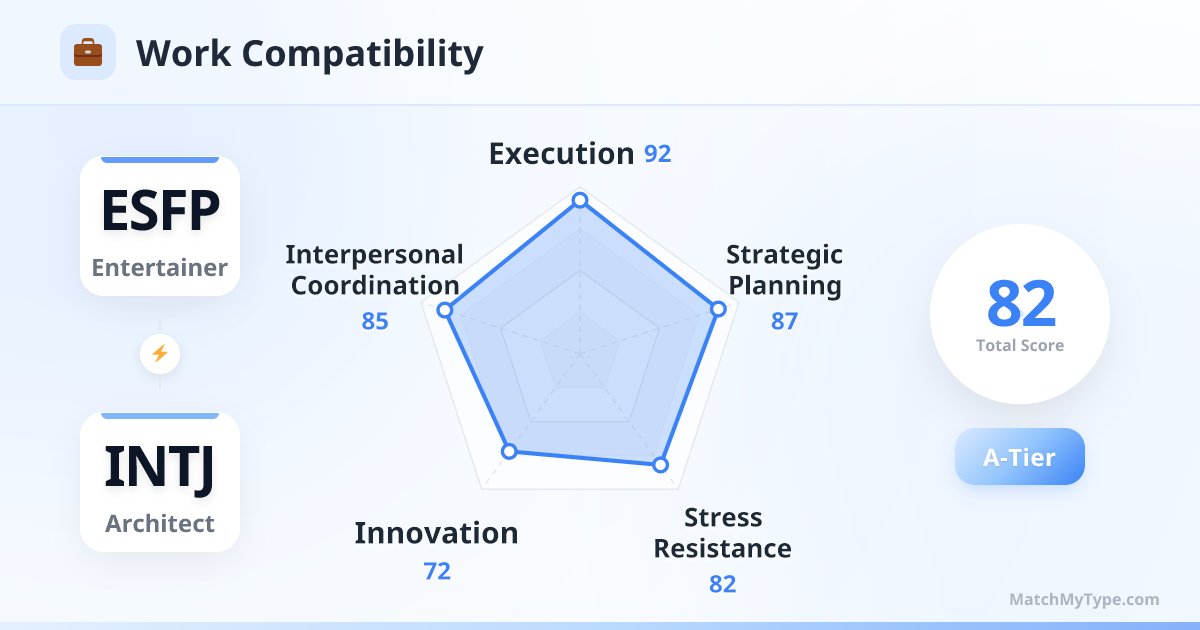 The stern mentor. The INTJ boss values results and efficiency and has zero patience for excuses. The ESFP subordinate needs to show tangible results (Sales/KPIs). The INTJ should use the ESFP's social talent for difficult clients rather than chaining them to an Excel spreadsheet.