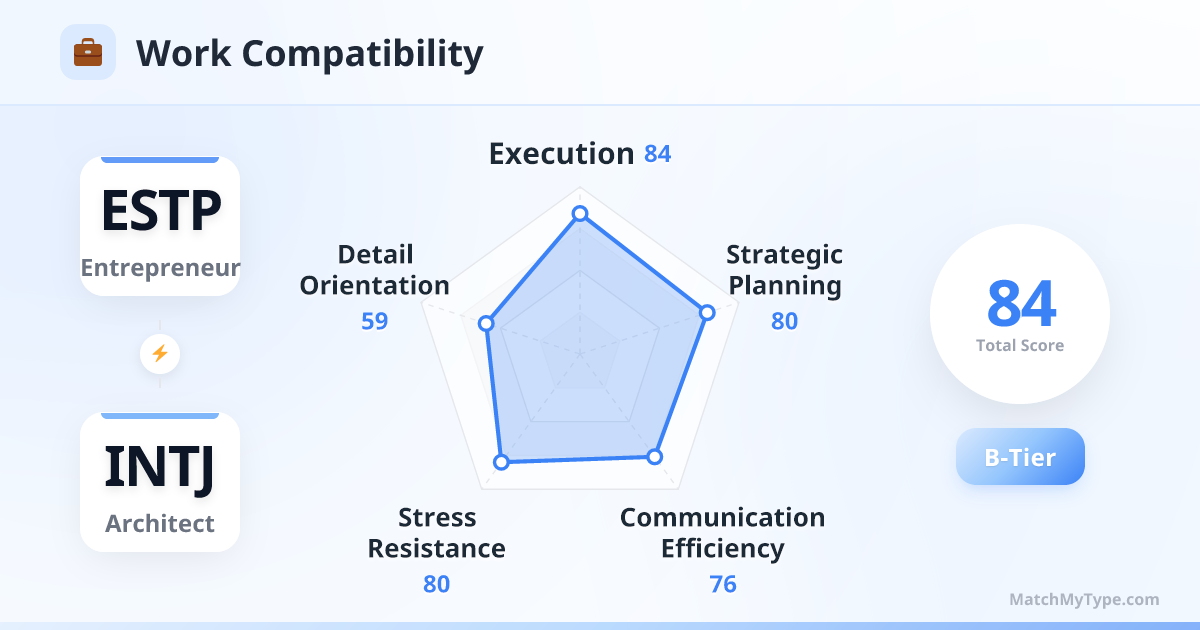 This is one of the most lethal business combinations in the MBTI universe. INTJ provides the top-level design and strategic blueprint, while ESTP provides the tactical execution and market PR. With a shared goal, you can dismantle any competitor.